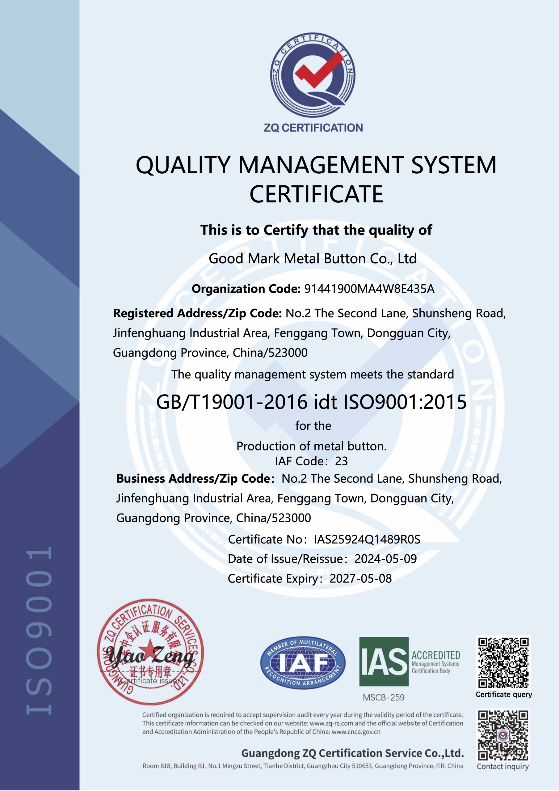 Good Mark Metal Button Co., Ltd was founded in 1992. Our head office is locating in Hong Kong. Factory is built in Guan Lan Town of Shen Zhen City in China.